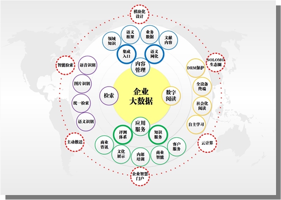 方正阿帕比提出的智慧企業(yè)概念是一種圍繞企業(yè)大數(shù)據(jù)進行的知識管理與服務的解決方案,它打破了傳統(tǒng)互聯(lián)網(wǎng)以信息形式管理文獻的方式方法,而是圍繞企業(yè)業(yè)務和培訓需要,進行企業(yè)知識的內(nèi)容管理、知識檢索、閱讀與其它智能化的應用服務,該解決方案全程對內(nèi)容進行語義化,從而使企業(yè)完成從信息化到智能化的升級轉變。
