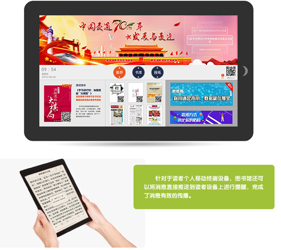 方正愛讀愛看移動(dòng)終端解決方案也為圖書館提供了移動(dòng)門戶解決方案:機(jī)構(gòu)可以將館內(nèi)的介紹、公告、活動(dòng)等一系列信息資訊通過后臺(tái)編輯,靈活的調(diào)整到各移動(dòng)終端上進(jìn)行展示。針對于讀者個(gè)人移動(dòng)終端設(shè)備,圖書館還可以將消息直接推送到讀者設(shè)備上進(jìn)行提醒,實(shí)現(xiàn)了消息有效的傳播。